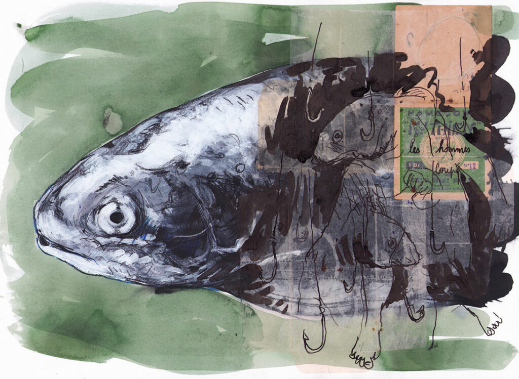 Technique : aquarelle, encre, craton, carton et hameçon sur papier