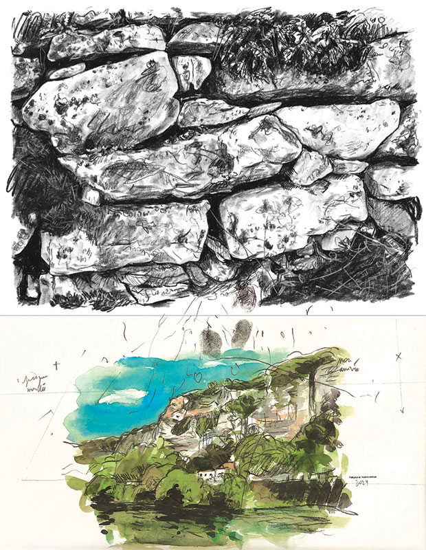 Technique : pierre noire, aquarelle et graphite sur papier